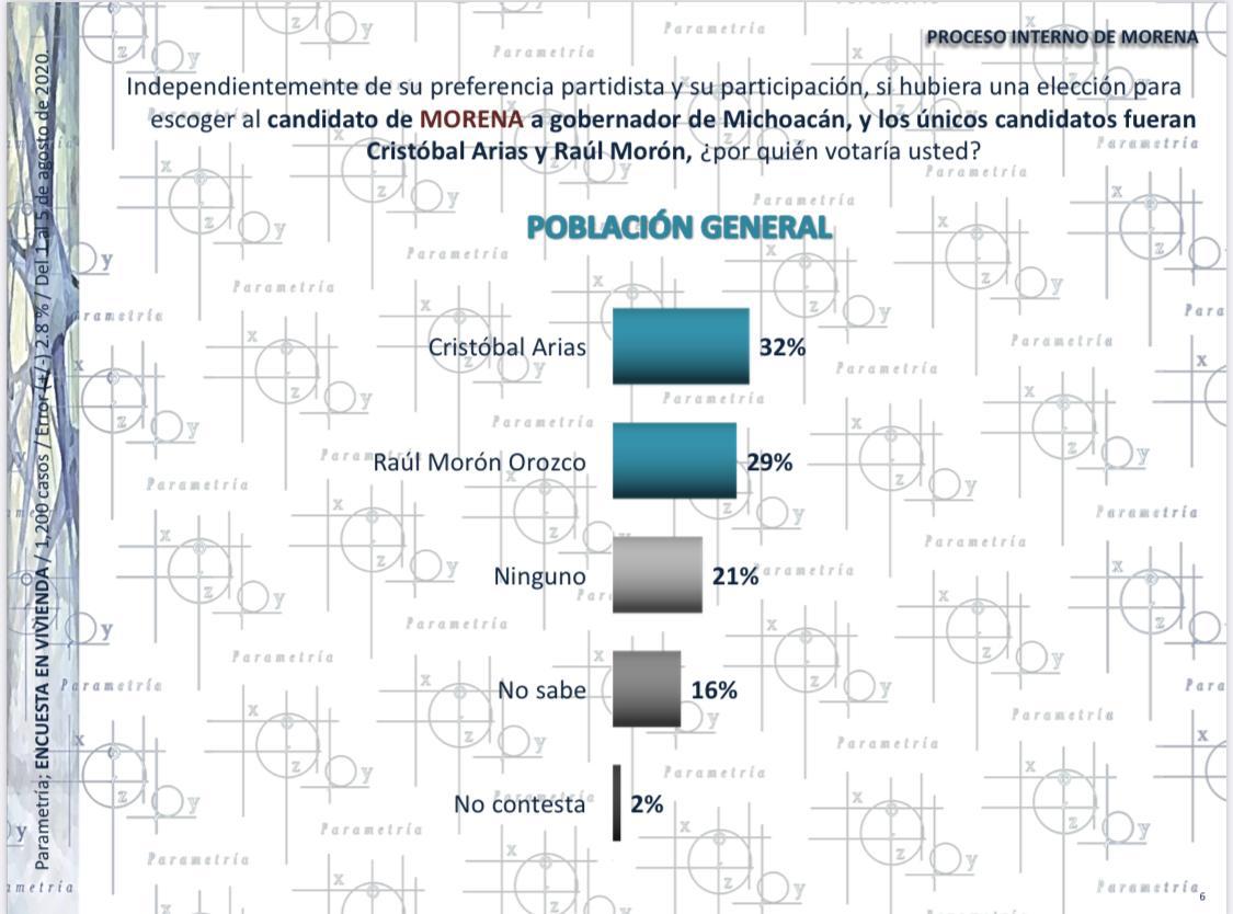 Esta semana se dio a conocer una encuesta de dicha empresa en la que prácticamente hay un empate técnico entre los aspirantes a la candidatura de Morena por la gubernatura de Michoacán: el senador Cristóbal Arias tiene 32% de las preferencias del voto y Raúl Morón el 29%.