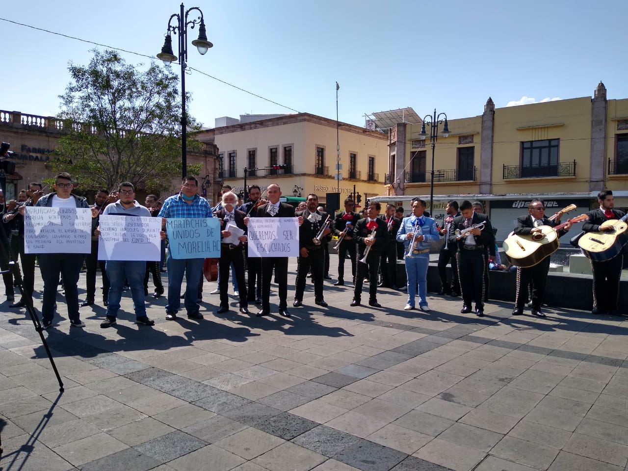 Morelia, Michoacán.- En demanda de un apoyo económico del gobierno del estado y el municipio ante la crisis por el COVID-19, la Asociación de Mariachis de Morelia con alrededor de 200 elementos, se manifestaron frente a Palacio de gobierno.