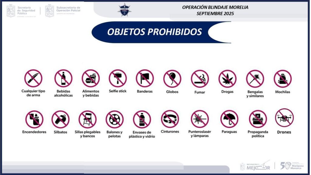 Morelia, Michoacán- Para garantizar el orden y la seguridad en las fiestas patrias, la Secretaría de Seguridad Pública (SSP) da a conocer la lista de objetos cuyo ingreso no estará permitido al primer cuadro del Centro de Morelia.