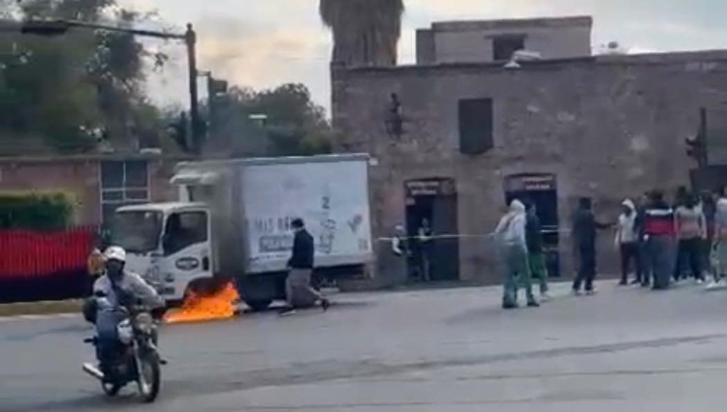 Morelia, Mich.-Un grupo de normalistas vandalizó un camión repartidor de productos lácteos en el Centro Histórico de Morelia. Los individuos arrojaron una bomba molotov a la unidad para incendiarla, trascendió en la labor noticiosa.