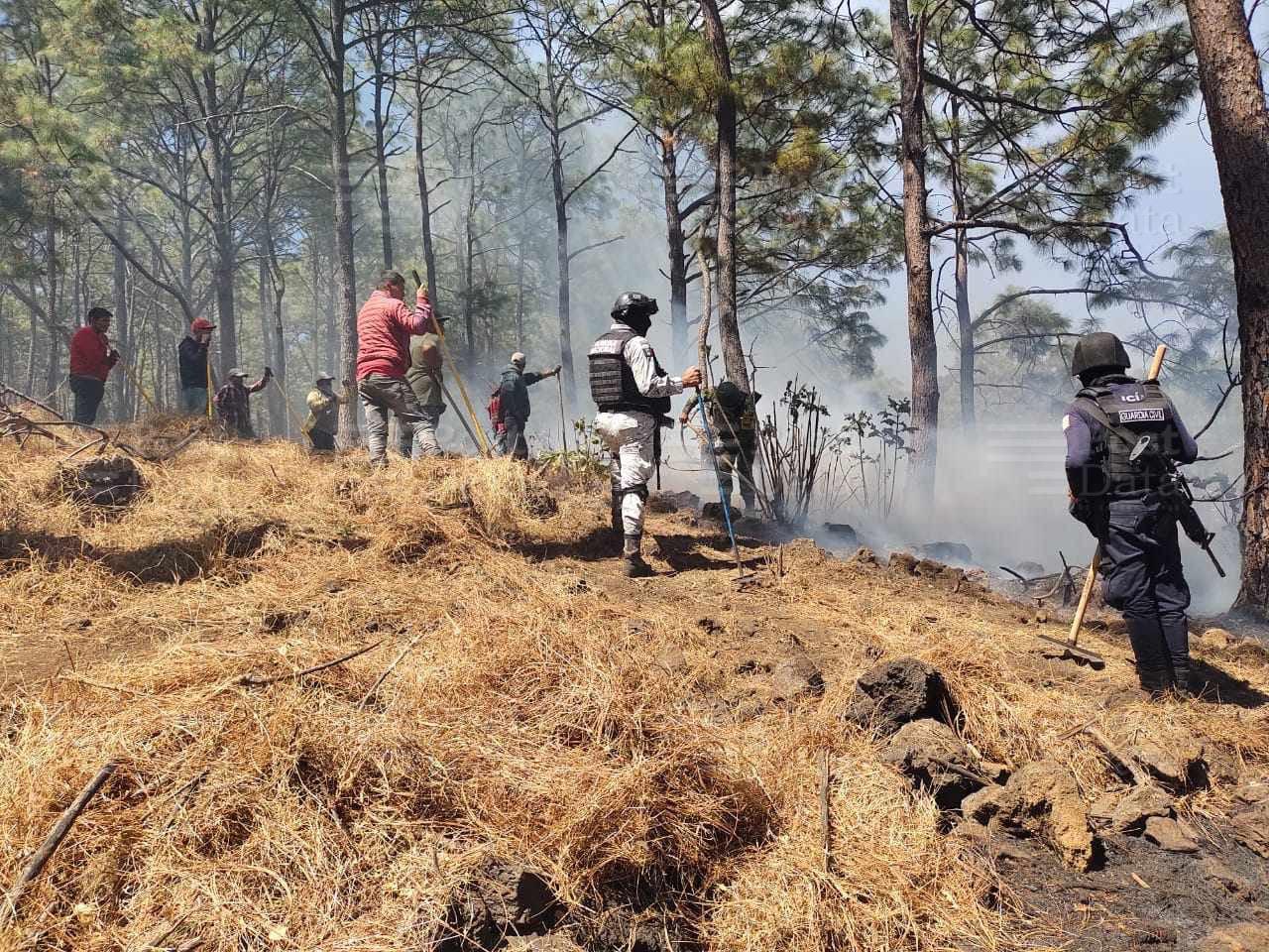 Apatzingán, Mich.- Los elementos de la Guardia Civil (GC), del Ejército y de la Guardia Nacional (GN) desplegaron un intenso operativo para sofocar un fuerte incendio forestal registrado en la sierra de Acahuato en el municipio de Apatzingán.