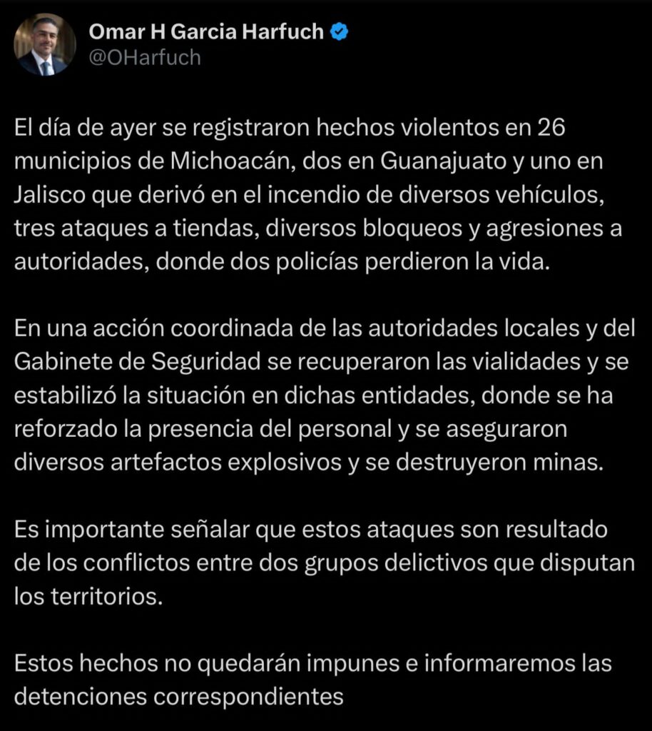 A través de sus redes sociales, el secretario de Seguridad y Protección Ciudadana (SSPC), Omar García Harfuch reiteró que los ataques que se perpetraron “son resultado de los conflictos entre dos grupos delictivos que disputan los territorios”.