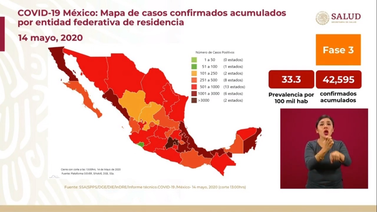 A 53 días de las jornadas de sana distancia en todo México, la Secretaría de Salud en su actualización diaria de la evolución del COVID-19, en las últimas 24 horas se contagiaron 2 mil 409 personas, acumulándose 42 mil 595 personas enfermas; mientras que, este día fallecieron 257 pacientes, sumando 4 mil 477 defunciones; así como 26 mil 746 casos sospechosos en el país.