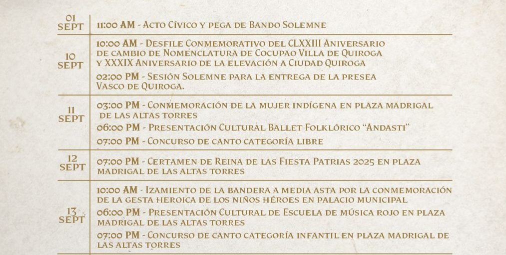 Quiroga, Michoacán Ayuntamiento de Quiroga, encabezado por la presidenta municipal Alma Mireya González Sánchez, llevó a cabo la presentación del Bando Solemne, en el se informa del programa de actividades culturales, cívicas, deportivas y recreativas que se desarrollarán a lo largo de septiembre.