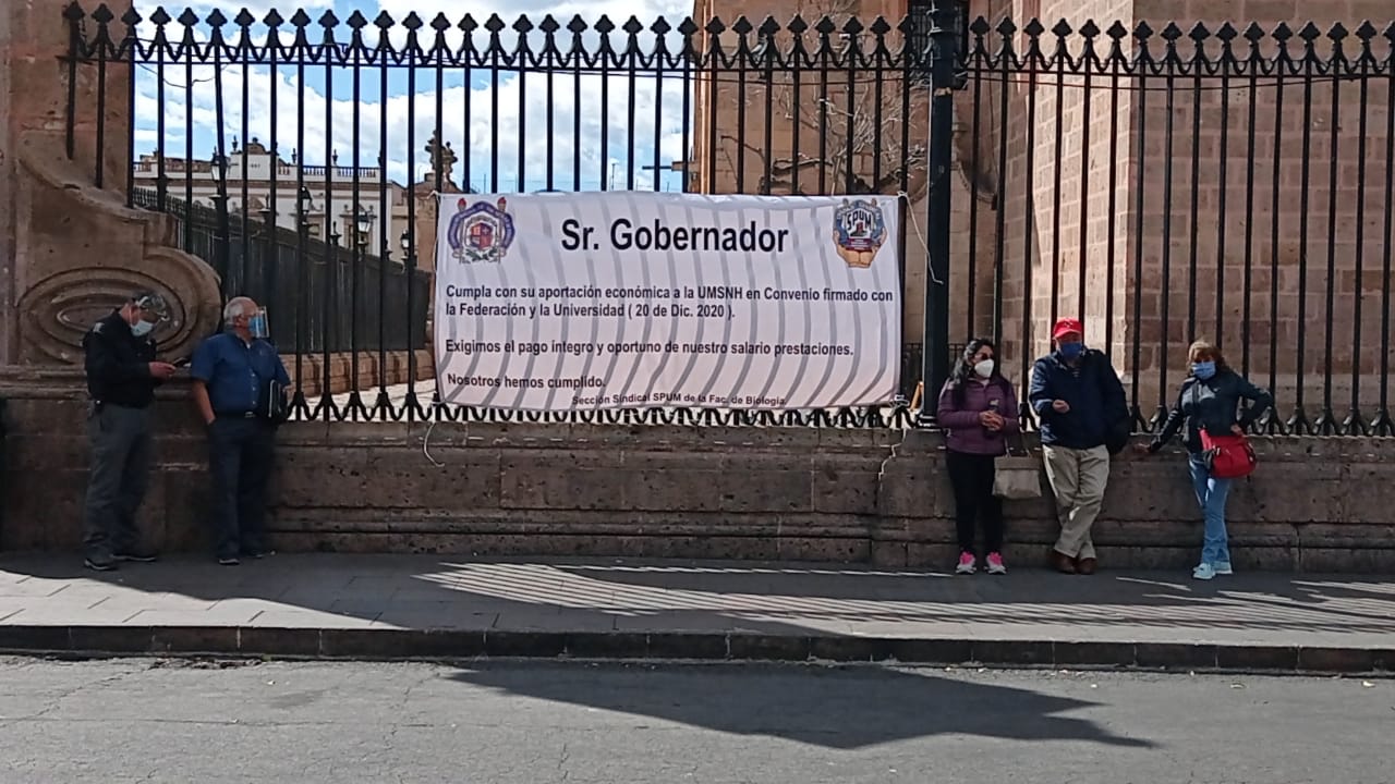 Solo 5 profesores de la Facultad de Biología asistieron a la manifestación frente a Palacio de Gobierno, en el centro histórico de Morelia, para exigir el pago del 75% de su aguinaldo adeudado por la Universidad Michoacana de San Nicolás de Hidalgo (UMSNH).