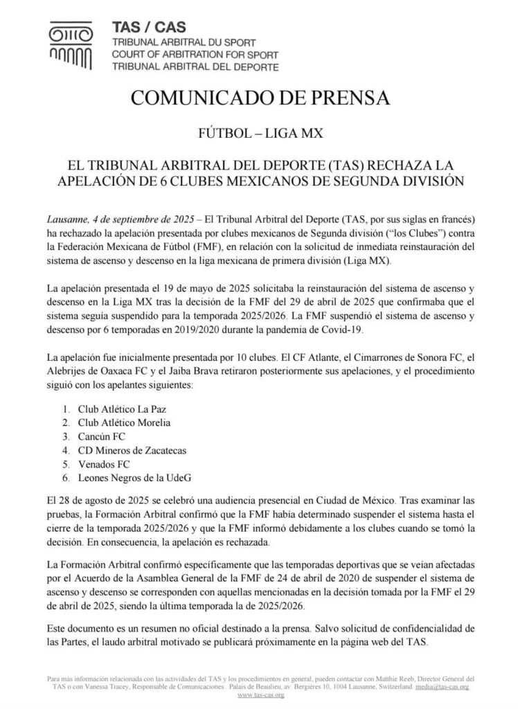 El Tribunal de Arbitraje Deportivo rechazó la apelación que los clubes Atlético Morelia, Atlético La Paz, Mineros, Leones Negros, Venados y Cancún FC presentaron ante este organismo contra la Federación Mexicana de Futbol, para pedir la reinstauración inmediata del sistema de ascenso y descenso.