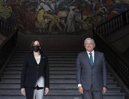 Sin cubre bocas, el jefe del Ejecutivo Federal dio la bienvenida: “vicepresidenta Kamala, un gusto”.