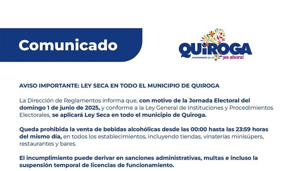 Quiroga, Michoacán.- “Nuestro deber como gobierno es garantizar que el proceso electoral se desarrolle en un ambiente de orden, legalidad y responsabilidad cívica”, expresó la presidenta municipal, Alma Mireya González Sánchez, al anunciar la aplicación de Ley Seca en todo el municipio el domingo 1 de junio de 2025, con motivo de la jornada electoral.