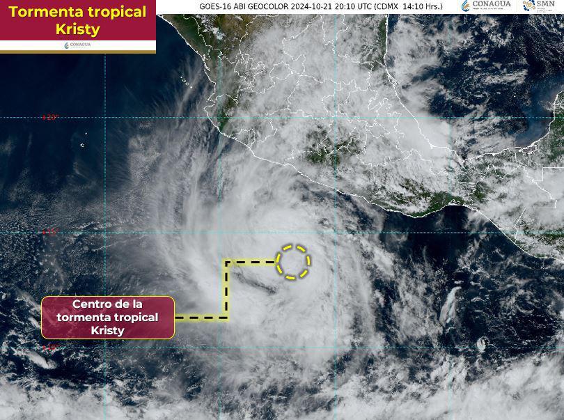 La tormenta tropical Kristy ocasionará lluvias puntuales muy fuertes (50 a 75 mm), además de rachas de viento de 40 a 60 km/hora, así como oleaje de uno a dos metros en Jalisco, Colima, Michoacán y Guerrero.