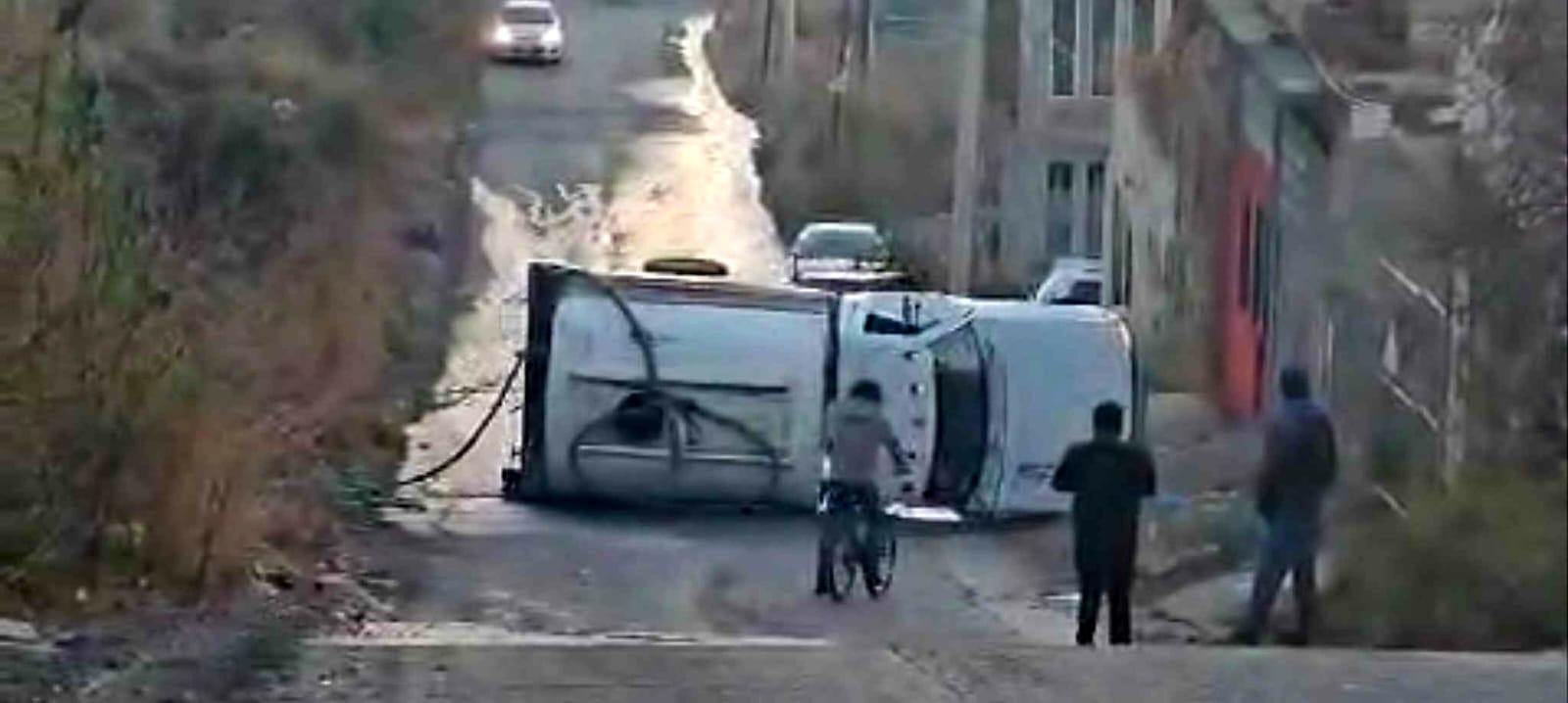 El primer incidente sucedió sobre la calle Maestro Samuel Joaquín Flores, a la altura de la colonia Lucio Cabañas, donde un automotor que transportaba un tanque de agua volcó y varios litros del esencial líquido se derramaron.