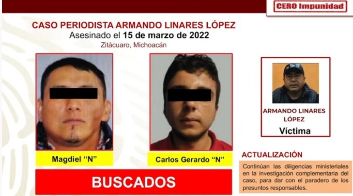 “El caso de Armando Linares López, hay dos órdenes de aprehensión y búsqueda que ha emitido la Fiscalía General de Michoacán, incluso ha ofrecido recompensas por estos dos sujetos: Carlos Gerardo ‘N’, quien es el autor material, quien habría disparado a Armando Linares; y Magdiel ‘N’, quien fue el que facilitó la logística, pidió el taxi donde se desplazó Carlos Gerardo y que tendría que ver directamente con el homicidio también de Armando Linares”.