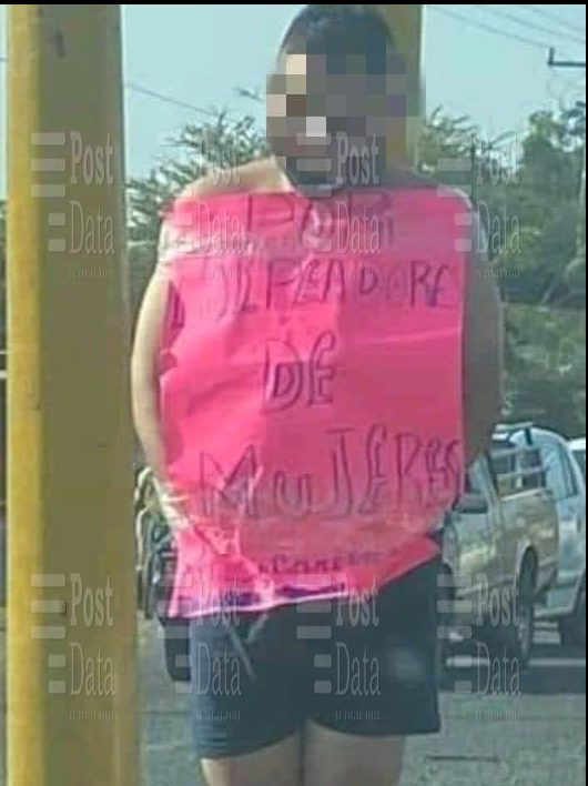 Ahí, frente a la tienda Aurrera los dos sujetos fueron exhibidos semidesnudos. Los ataron con cinta canela a unos postes de semáforos y les colocaron unas cartulinas en las que los señalaban de golpear a sus esposas. Los letreros rezaban: “Esto me pasó por golpeador de mujeres”.
