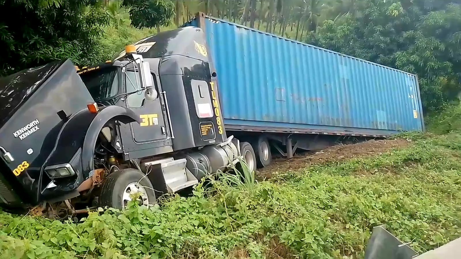 Parámedicos acudieron al sitio del percance y confirmaron que no había personas heridas, solo hallaron siniestrado el tráiler, un Kenworth Kenmex de color negro y número económico 083.