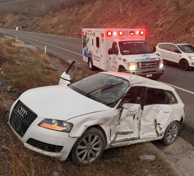 Al arribar al sitio, los socorristas localizaron un vehículo Audi A3, color blanco, con placas PTL-773-B, el cual se encontraba fuera de la cinta asfáltica y sin ocupantes, por lo que se presume que fue abandonado tras el percance.